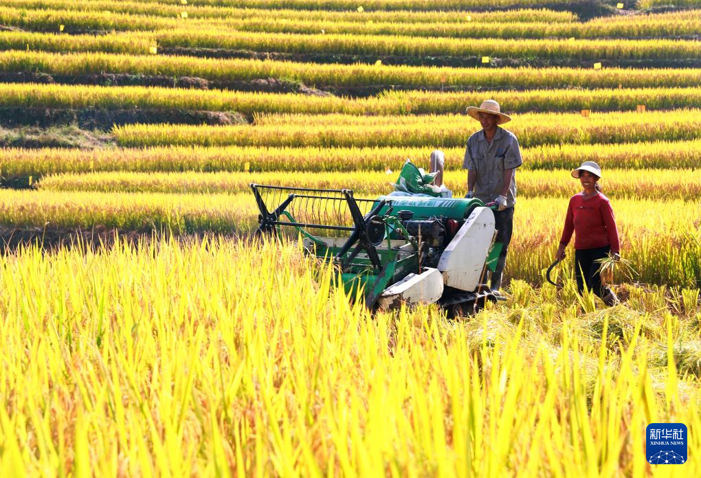 10月10日,湖北省宜昌市秭归县沙镇溪镇长春村村民驾驶农机在田间收获水稻。新华社发(王罡摄)
