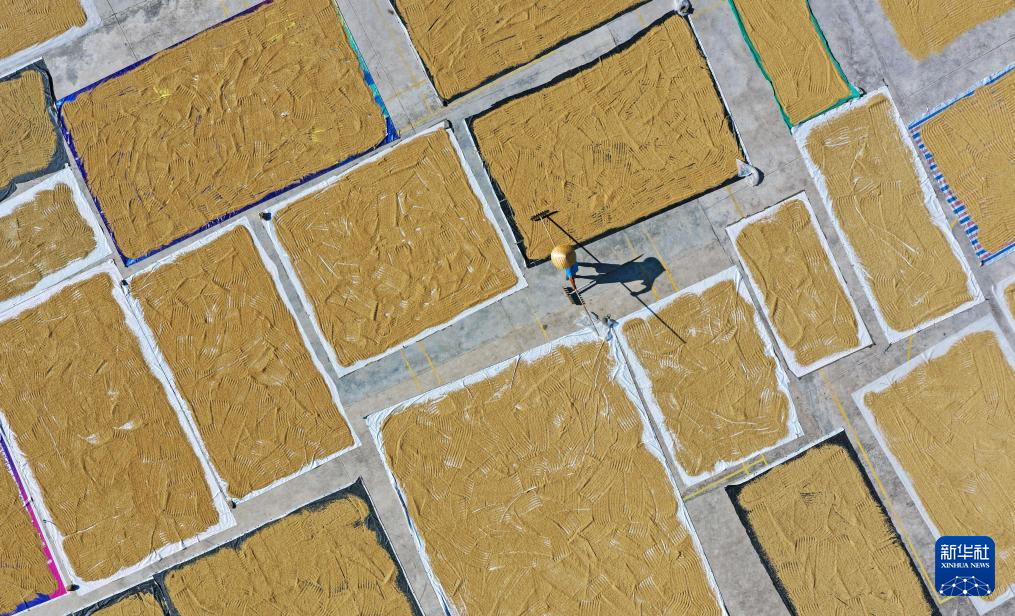 10月10日,浙江省台州市仙居县官路镇增仁村农民在晾晒稻谷(无人机照片)。新华社发(王华斌摄)