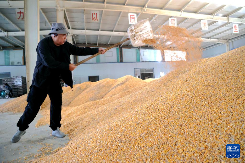 10月10日,在山东省滨州市高新区小营街道一处粮食烘干服务点,工作人员整理烘干后的玉米。新华社发(初宝瑞摄)