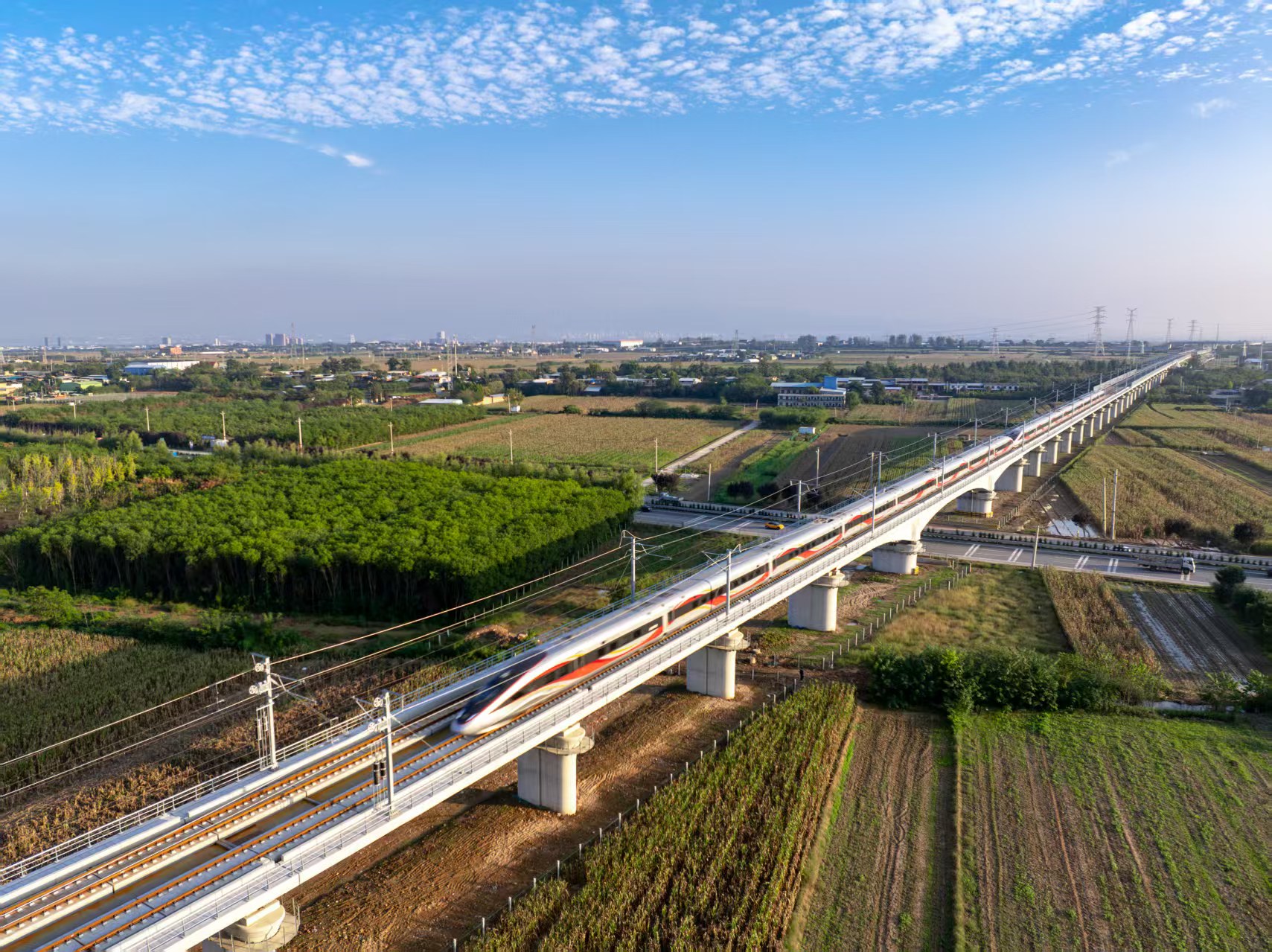 重联动车组逐级提速试验是高铁联调联试的重要测试环节,具体指将两列同型号8节动车组联挂形成16节编组列车,按不同速度等级逐步提升运行速度,在列车运行中对沿线接触网进行高速综合检测,同时验证轨道平顺性、接触网供电稳定性、通信信号传输质量等核心指标。此次试验中,重联列车从250公里/小时起步,历经多个速度等级调试,最终达到350公里的设计时速并稳定运行。