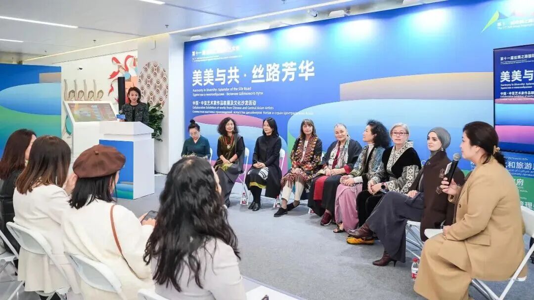 活动启动仪式之后,现场还举办了“美美与共·丝路芳华”中国—中亚文化艺术交流沙龙,八位参展艺术家与陕西本土文化学者以及机构代表艺术家们围绕创作理念、丝路文化传承、跨国合作前景等议题分享见解。