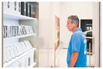 作为许多来华外国游客入境游“第一站”,上海见证了强劲的入境游消费活力。今年上半年,上海海关共验核离境退税申请单6.4万票,比去年同期大幅增长1.4倍,数量与去年全年总单数基本持平。图为近日,外国游客在位于上海市南京路步行街的华为商店里浏览电子产品。