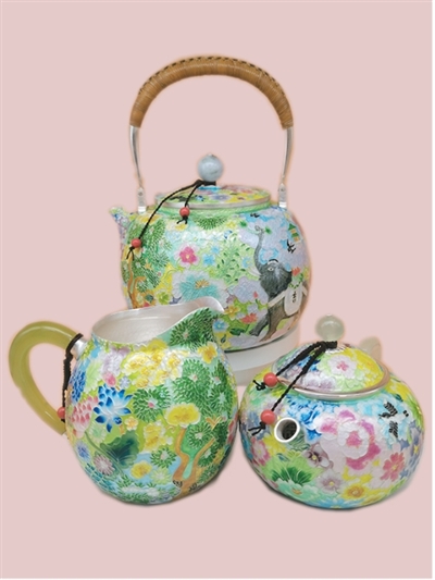 谭志平设计的茶具作品“彩银之蓝”,包含花朵、大象、孔雀等云南特色元素。