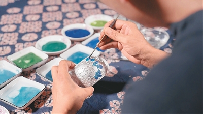 “以银为胎,掐丝为骨,珐琅作魂”是谭志平制作珐琅银器的秘诀。烧制银器成型后,谭志平用极细的银丝勾勒图案,这一步叫“掐丝”。“0.3毫米的银丝要18次弯折,才能勾勒出牡丹的美。”谭志平说,银丝图案定型后,再小心翼翼地给银器加温,让银花焊牢在银壶上。经过清洗后,下一步就是“填蓝”。