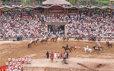 游客在万岁山武侠城观看实景演出《三打祝家庄》。