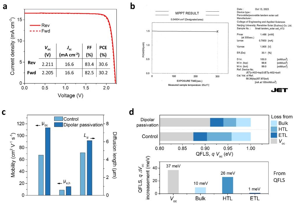 经国际权威第三方机构认证,用钝化处理技术制备的新型全钙钛矿叠层光伏电池,光电转化效率达30.1%,这是此类电池效率首次突破30%,目前已被国际《太阳能电池效率表》收录。