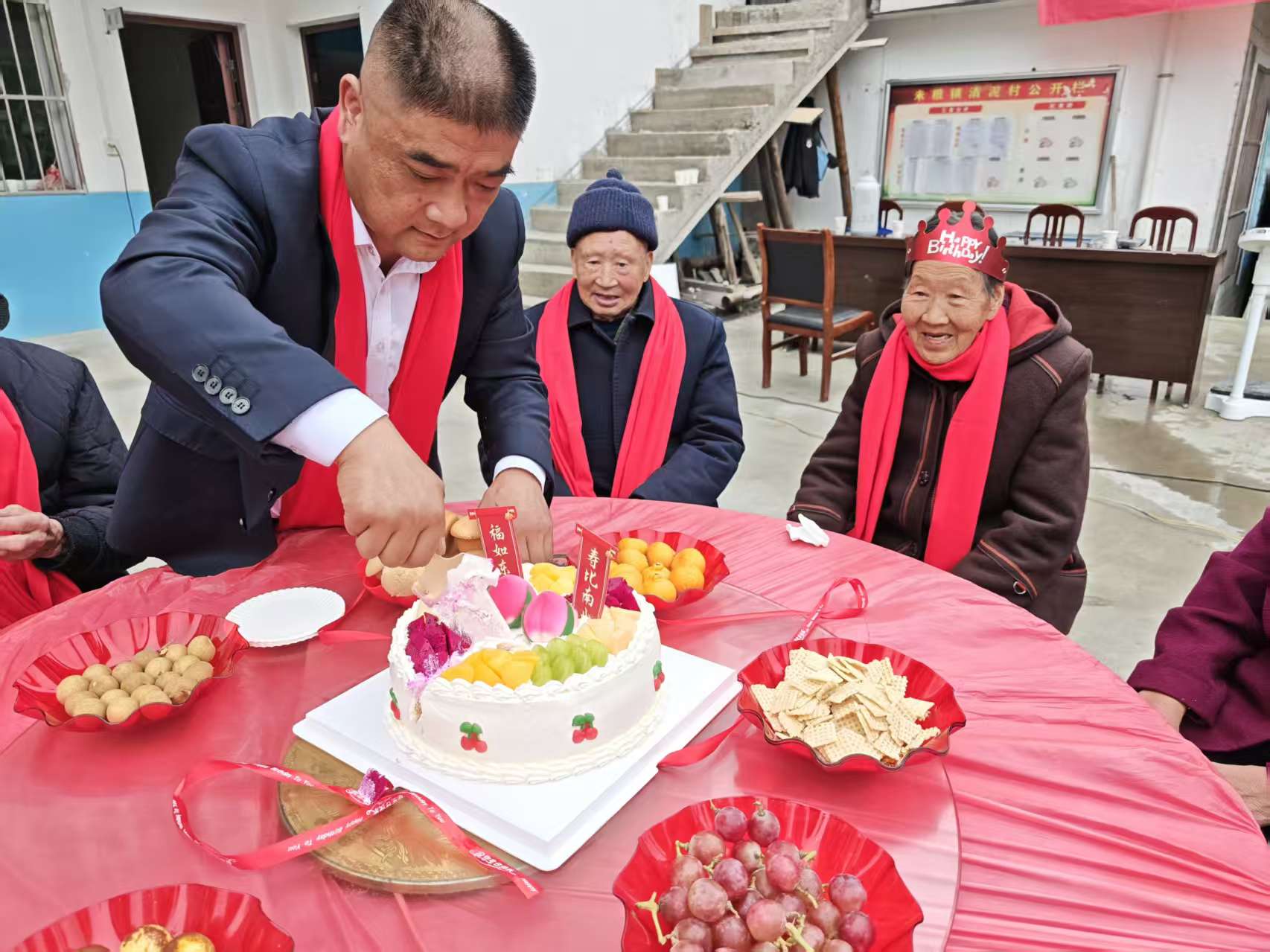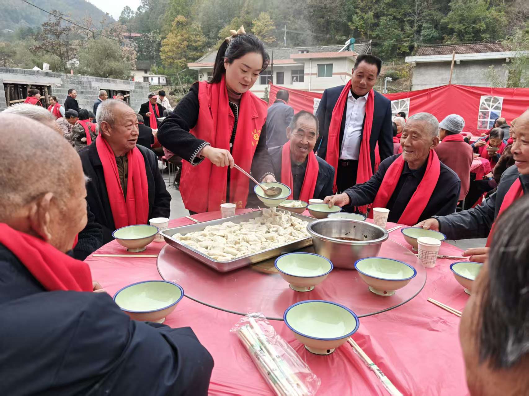 美食盛宴,凝聚邻里乡情。清泥村“两委”干部、党员志愿者、热心村民早早齐聚活动现场,调馅和面、包饺子,分工协作,配合默契,欢声笑语驱散了秋日微凉。随着热气腾腾的饺子出锅,志愿者们将一碗碗饱含深情与祝福的饺子送到老人们手中,滚烫的香气里裹挟着浓浓的关爱,老人们脸上洋溢着幸福满足的笑容。活动现场更藏着暖心惊喜——为当月过生日的八位老人集体庆祝生日,全场合唱生日歌,志愿者为他们送上精心准备的大蛋糕和慰问品。宴席之上,鸡鸭鱼肉等佳肴摆满餐桌,老人们围坐畅谈,闲话家常,醇厚的乡情在饭香氤氲中愈发浓烈,邻里情谊在欢声笑语中愈发深厚。