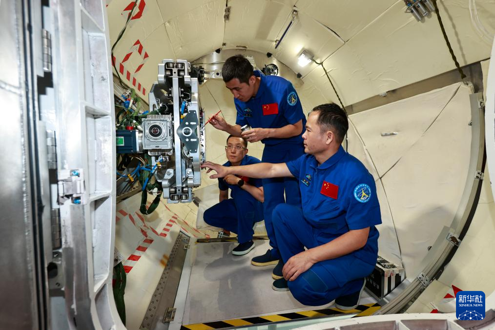 武飞(左)、张陆(中)、张洪章进行植物培养训练(2025年8月28日摄)。新华社发(徐部 摄)