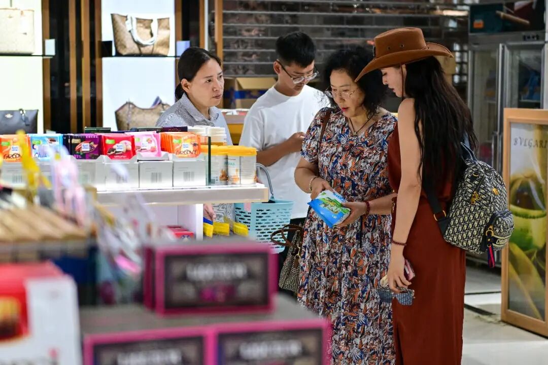 2024年7月26日,游客在新疆霍尔果斯市中哈霍尔果斯国际边境合作中心的免税店挑选商品。新华社记者 丁磊 摄