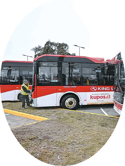 在智利科皮亚波拍摄的中国生产的新能源公交车。
