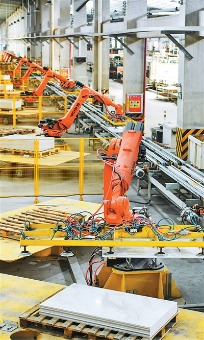 江西省丰城市唯美陶瓷有限公司的工业机器人在全自动化陶瓷生产线上赶制产品,该公司已实现全数字化智能生产。