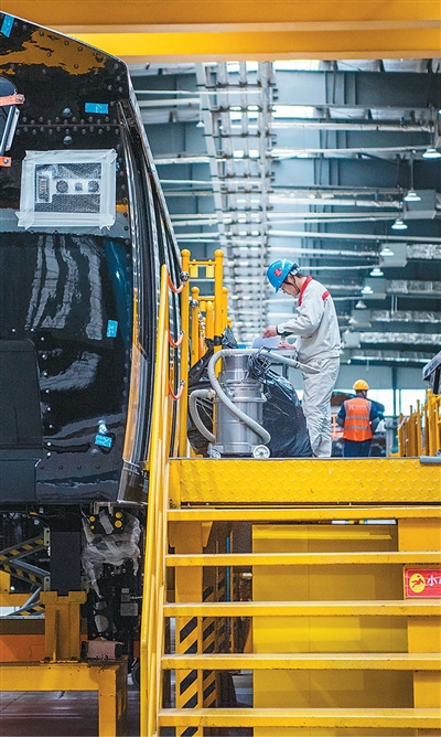 在安徽省芜湖经济技术开发区的中车浦镇阿尔斯通运输系统有限公司车间里,工人在生产制造无人驾驶轨道列车。