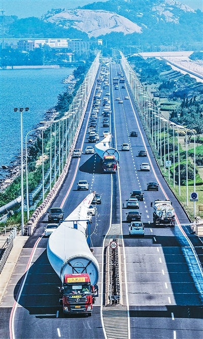 近年来,山东省荣成市加速构建“核风光储”齐聚的新型能源体系,一体布局资源开发和产业培育。图为风电叶片从荣成市石岛管理区装车发货。