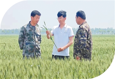 郝展宏(中)查看小麦田间生长情况。