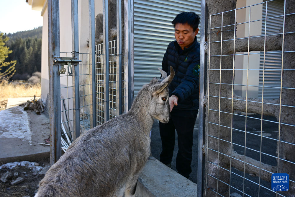 11月10日,在救护繁育站,工作人员刘林春和一只被救助的岩羊互动。