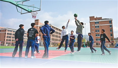 在青海西宁市果洛西宁民族中学,学生在打篮球。