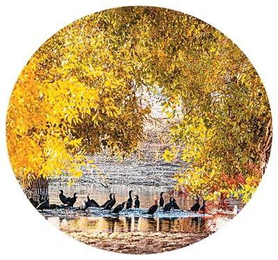 11月1日,游客在沙雅县沙雁洲景区内欣赏胡杨林。