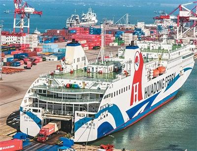 “双11”前夕,山东省荣成市石岛新港国际快件监管中心跨境电商包裹量明显增加。图为石岛新港口岸,外籍客货滚装船在装卸货物。