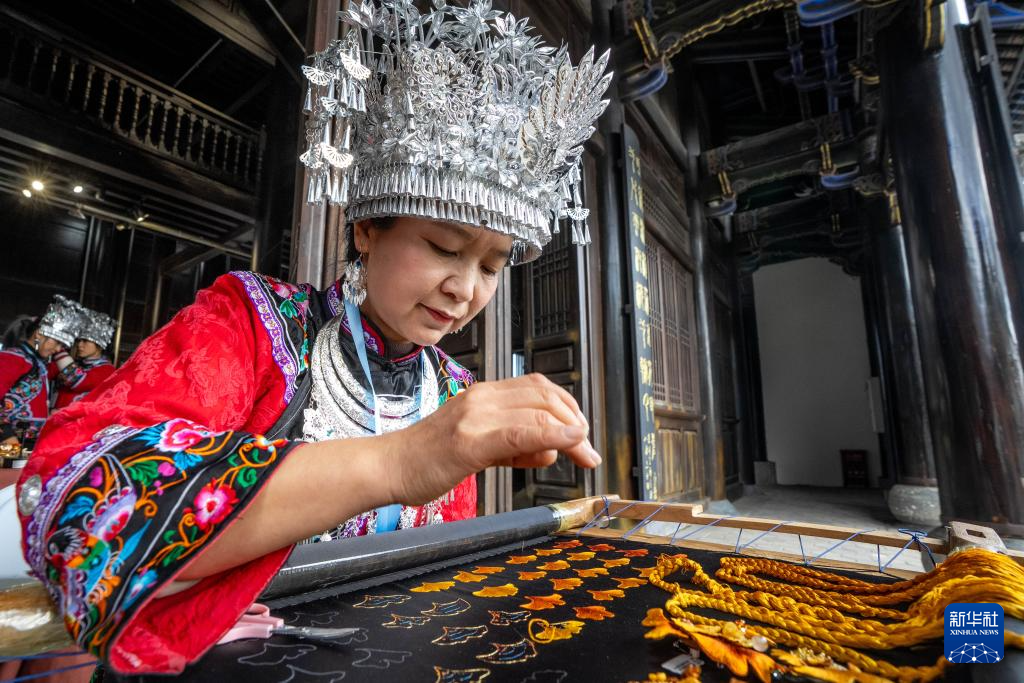 11月23日,重庆酉州苗绣市级传承人陈国桃在2025非遗品牌推广周上刺绣。新华社记者 胡超 摄