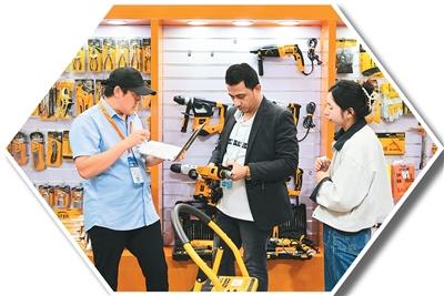 在浙江省金华市义乌国际博览中心,国外客商(中)在第31届中国义乌国际小商品博览会—出口商品展上洽谈采购五金电动工具。