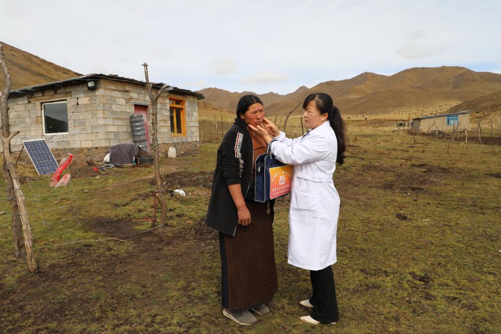 王蒋艳在屋外为牧民索南草检查伤口。新华社记者 梁军 摄