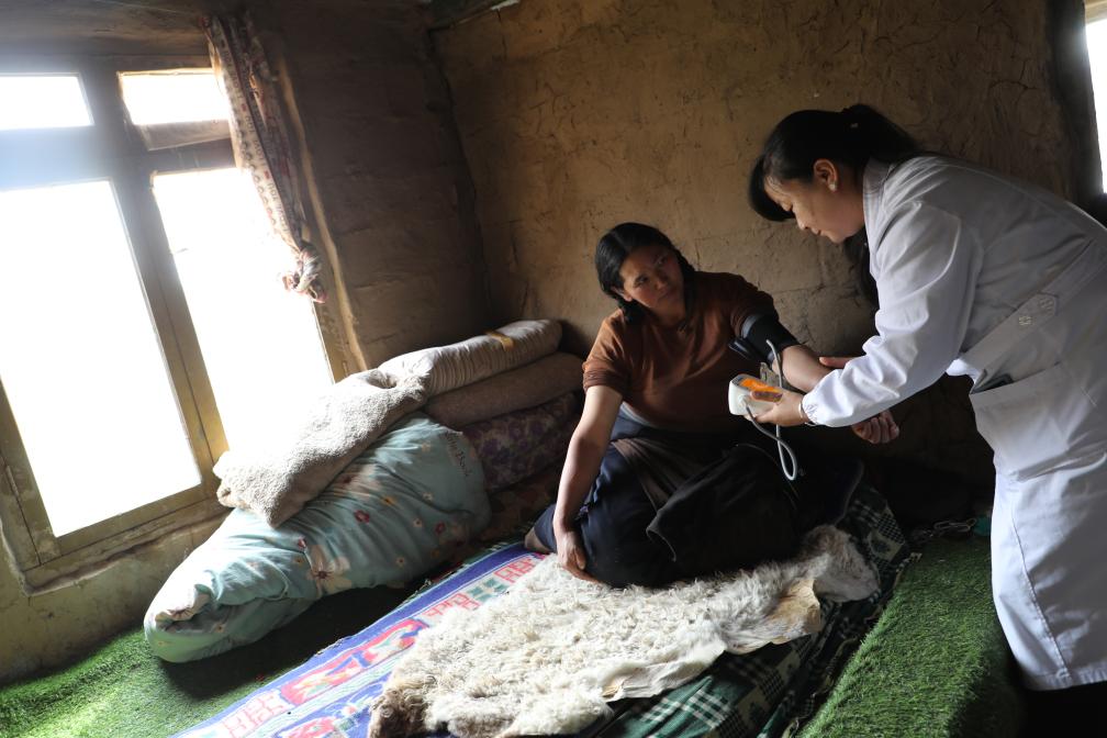 王蒋艳为牧民索南草测量血压。新华社记者 梁军 摄