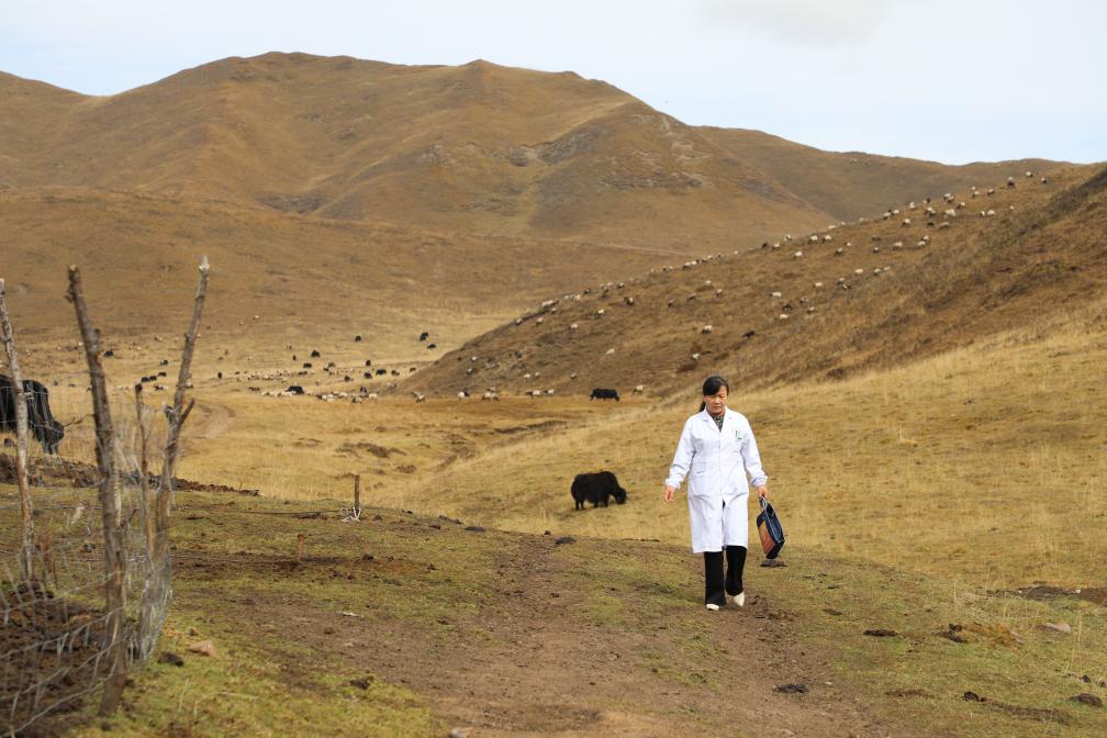 这天,王蒋艳乘车来到60公里外的藏族牧民索南草家中。从县城到牧场的路面坑洼不平,牛羊不时“阻断”去路,往返一趟常常耗费大半天。