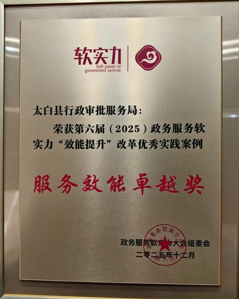 12月17日,“2025年第六届政务服务软实力·政务服务大厅数智化转型研讨会”在浙江省衢州市举行,太白县行政审批服务局申报案例“守好秦岭生态底线 跑出审批服务加速度”,荣获第六届(2025)政务服务软实力“效能提升”改革优秀实践案例“服务效能卓越奖”,这是继2022年以来,连续第4年获得全国性奖项。