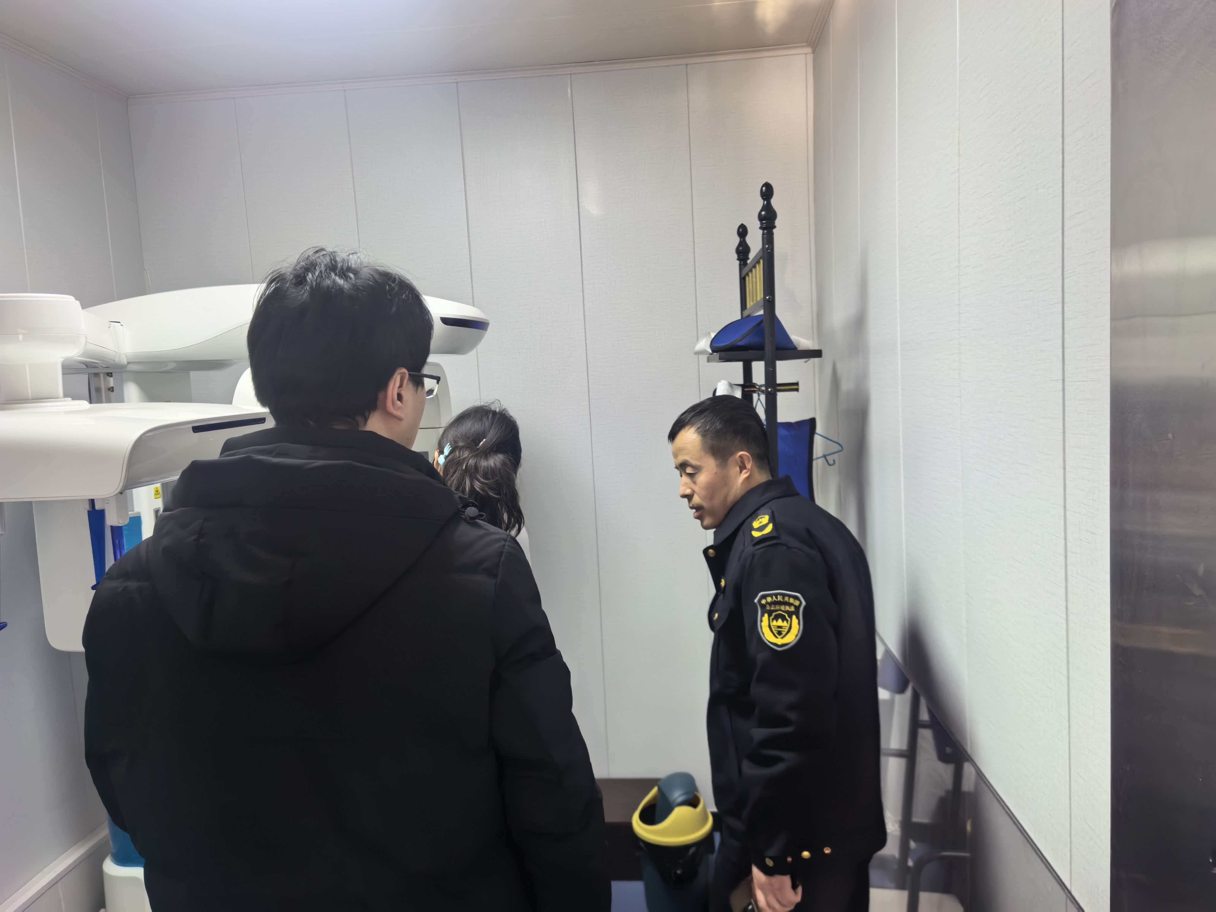 执法过程中,工作人员坚持“执法 + 服务”并重的原则,扎实开展辐射安全监管工作。一方面,依据《中华人民共和国放射性污染防治法》《放射性同位素与射线装置安全和防护条例》等法律法规,对排查发现的问题分类处置:针对无证开展放射诊疗的违法行为,当场责令停止相关作业,坚决杜绝 “带病运行”;针对防护设施不规范、台账记录不完整等轻微问题,督促指导口腔诊所及宠物医院立行立改。另一方面,主动向相关机构负责人普及辐射安全法律法规和防护知识,耐心解答机构在辐射许可证办理、设备检测、人员培训等方面的疑问,引导经营主体增强法治意识和安全责任意识,自觉规范放射诊疗行为。