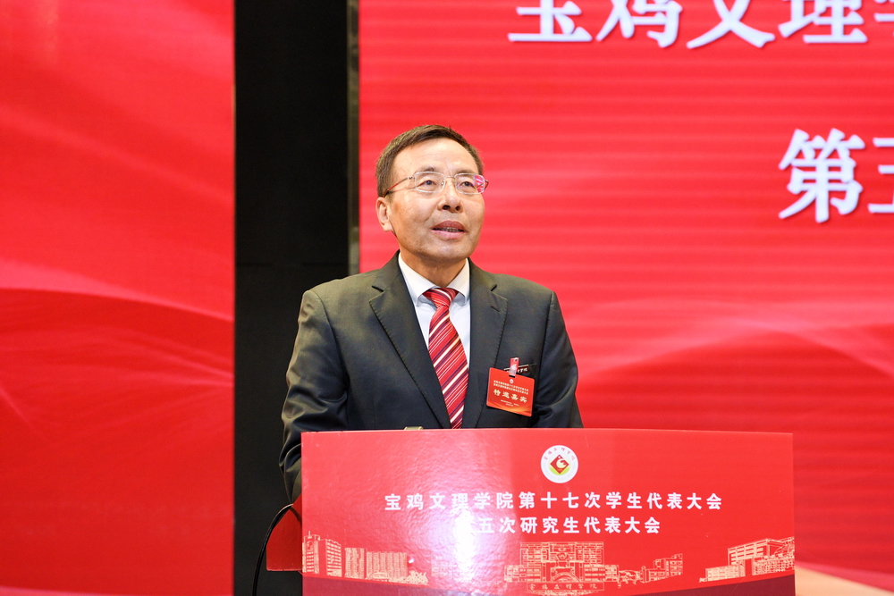 近日,宝鸡文理学院第十七次学生代表大会、第五次研究生代表大会在高新校区博文楼报告厅召开。学校党委书记郭霄鹏、党委副书记韩干校,陕西省学生联合会驻会执行主席张一洋出席大会。会议由校团委书记郭理想主持。