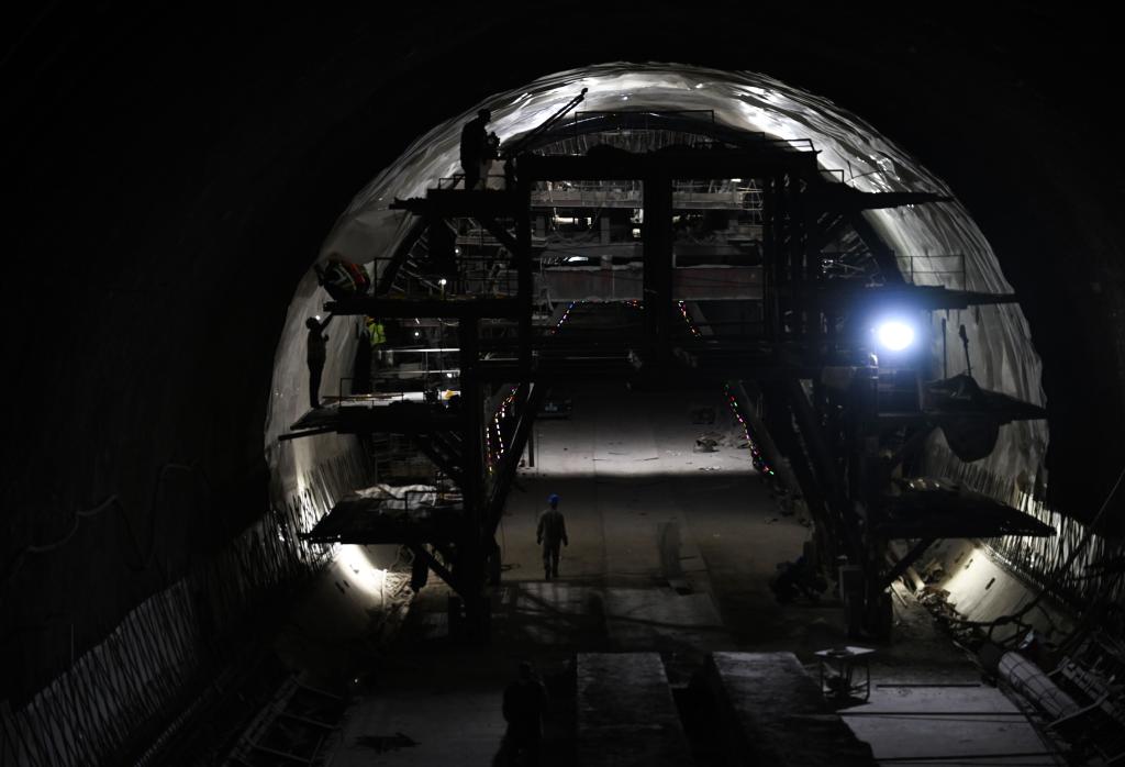 2月13日,中国铁建大桥局工人在西延高铁铜川隧道施工。新华社记者 张博文 摄