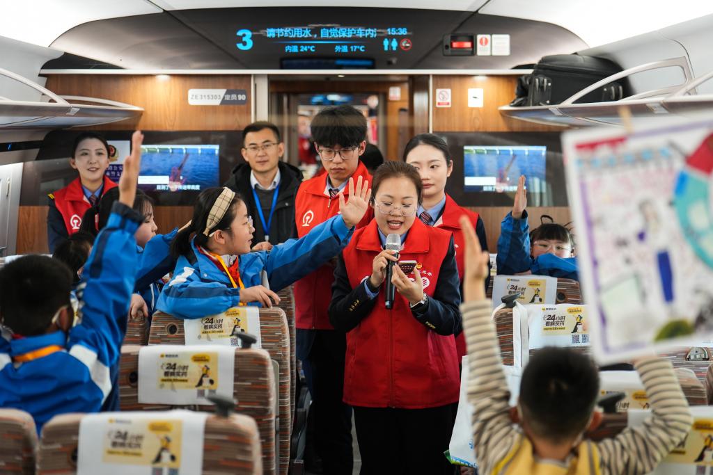 12月7日,中小学师生代表在开往西安北站的复兴号动车组列车上参加答题游戏。新华社发(刘翔摄)