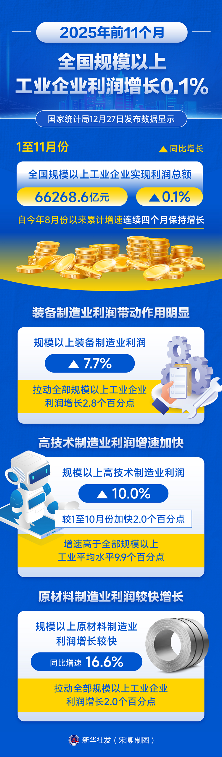 新华社北京12月27日电(记者王雨萧)国家统计局27日发布数据显示,1至11月份,全国规模以上工业企业实现利润总额66268.6亿元,同比增长0.1%,自今年8月份以来累计增速连续四个月保持增长。