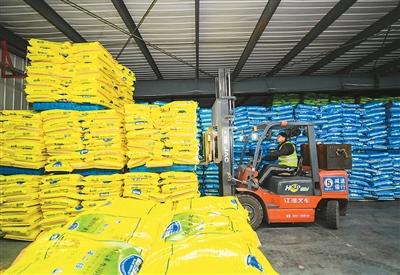 新疆维吾尔自治区昌吉回族自治州呼图壁县的一农资储备库内,工人正驾驶叉车将化肥转运至仓库。