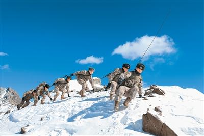 天山南麓,-20℃的严寒中,新疆军区别迭里边防连战士踏积雪、爬陡坡,守护脚下的每一寸国土。