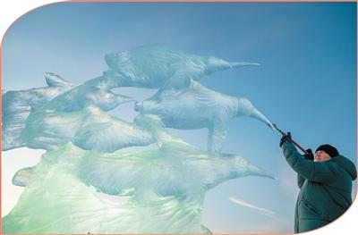 黑龙江哈尔滨冰雪大世界,冰雕师在严寒中精雕细琢。