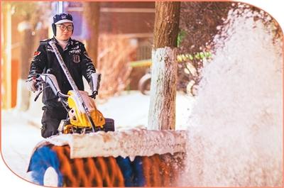 近日,甘肃省张掖市甘州区迎来降雪天气。甘州区饮马桥社区工作人员在清扫辖区道路积雪。