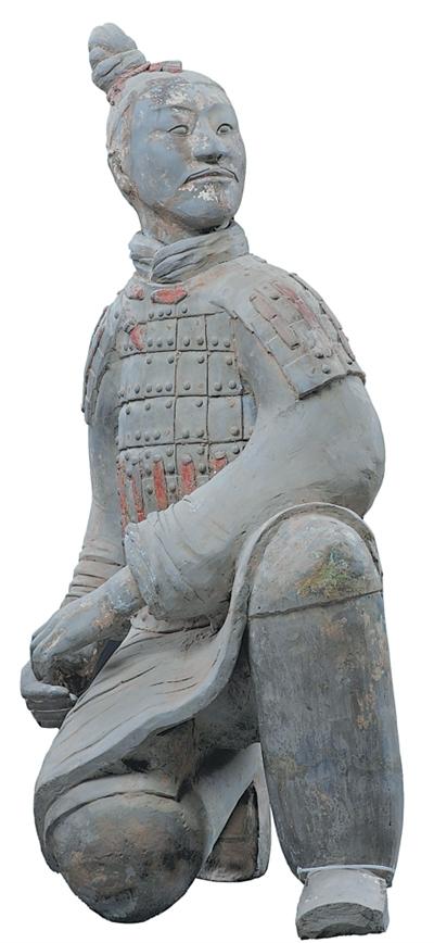 1977年出土于陕西省西安市临潼区秦俑二号坑。武士单膝跪地,身体侧转,双手于腹前作握弓状,发髻、衣甲、鞋履刻画精细,体现秦兵马俑强烈的写实风格。