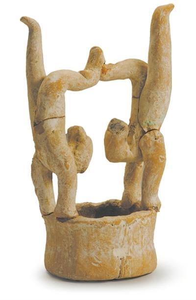 2007年出土于陕西省西安市临潼区岩上村。为双人杂技俑,通体施白色彩绘,发髻饰黑色彩绘。两人均双手对称握缸沿倒立,右脚底相接,左脚伸直,头向上扬起。姿态生动,是研究汉代体育和表演艺术的重要实物。