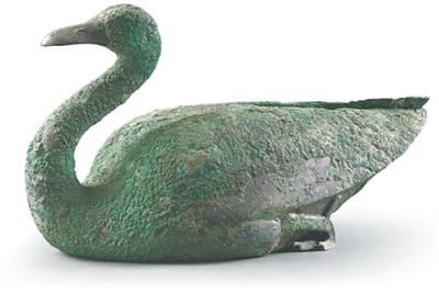 2001年至2003年出土于陕西省西安市临潼区秦始皇陵园。铜雁颈部呈S形,腿及爪趾紧收于腹下,前爪向前平伸,呈平卧姿态,双翅收于尾后,静中有动,栩栩如生。
