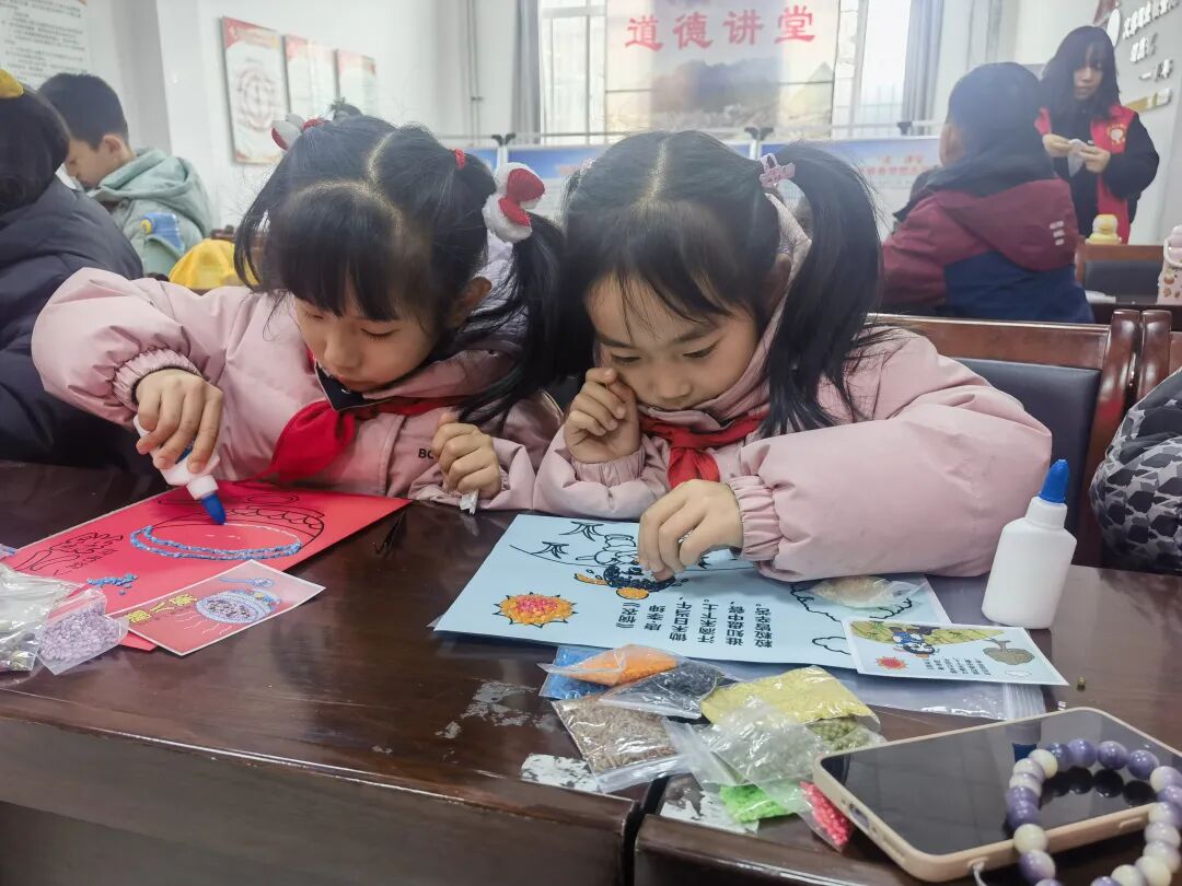 紧接着,在杨家坪社区多功能活动室内,社区干部张旭东以一句耳熟能详的“小孩小孩你别馋,过了腊八就是年”民谣开场,向现场学生们生动讲述了腊八节的起源传说、传统习俗及其蕴含的感恩祈福、勤俭节约的文化精神。而后,在“巧手·腊八体验”环节,孩子们在志愿者的引导下,化身“五谷艺术家”。他们以红豆、绿豆、黄豆、黑米、小米等腊八食材为“笔墨”,在卡纸上精心构思、细心拼贴。不一会儿,一幅幅象征福气的“福”字、寓意吉祥的“一马当先”、香甜可口的“腊八粥”、体现节约主题的《悯农》诗意画等图案跃然纸上。孩子们互相展示作品,你看着我我看着你,互相打趣,现场充满了欢声笑语。