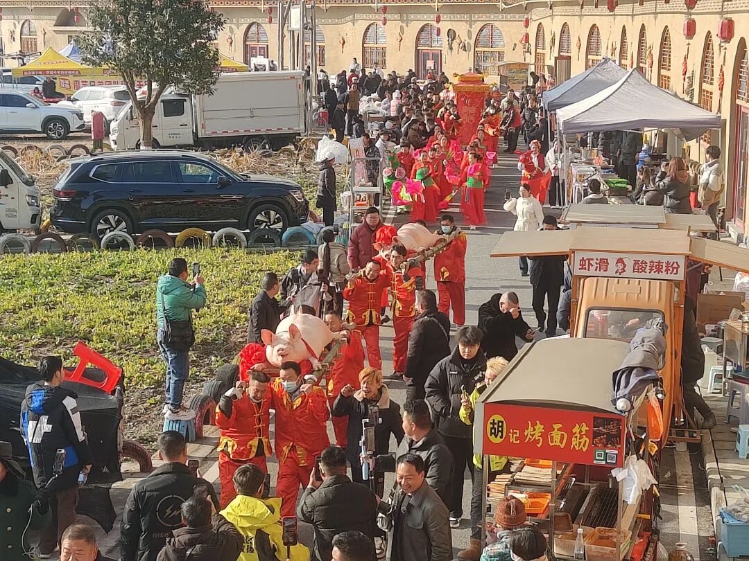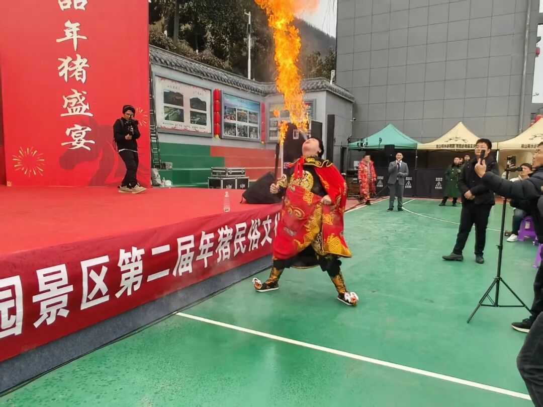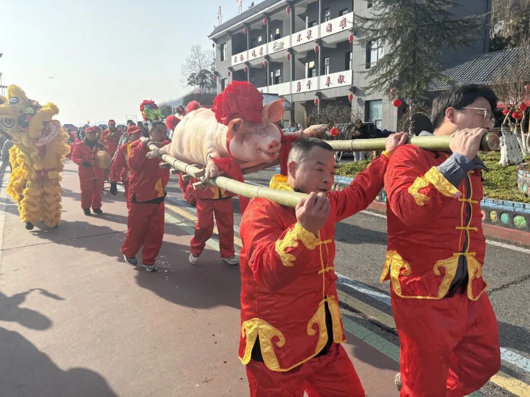 活动现场,披红挂彩的“年猪状元”在秧歌队、锣鼓队簇拥下在景区内祈福巡游,铿锵的锣鼓在山谷回响,轻快的舞步欢跳出新年喜气。富裕起来的乡村人,禁不住用自己特有的方式歌颂美好生活,表达对来年风调雨顺、五谷丰登的期盼。浓浓的庆典场面,让现场热情爆满,从全国各地奔赴而来的网友们纷纷拿出手机拍照,记录这充满年味的瞬间。