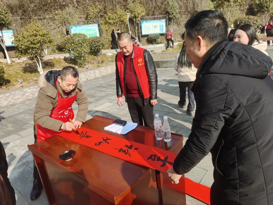 宴席之外,趣味活动精彩纷呈。文艺表演团队带来的舞蹈、独唱、魔术变脸等节目依次上演;助力登场的各地网红主播们倾情推介白河美食美景、点赞仓上民俗年趣,将热闹火爆的“年猪宴”推上一波波高潮。在柒家苑民俗街,县书法协会的老师们饱蘸笔墨,尽情挥毫,为当地村民和游客书写出一幅幅寓意美好吉祥的大红春联,前来求写对联的人排队等候。在年货大集展区,来自安康、白河其他乡镇和仓上本地特色农产品土猪肉、牛羊肉、香肠、土鸡蛋、干菜、杆儿酒、蜂蜜等年货及手工艺品、年节礼盒、快餐小吃摆了一条街,叫买叫卖声不绝于耳。观众和游客们穿梭其中,挑选各自中意的年货,一场“年猪宴”成为带动村民增收的消费“舞台”。