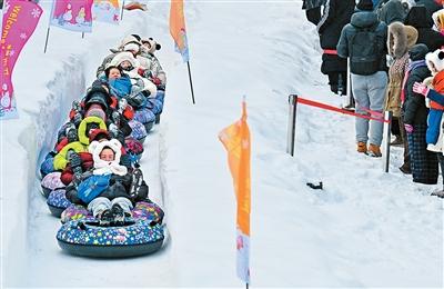 游客在本溪大冰沟景区体验“雪圈贪吃蛇”特色项目。