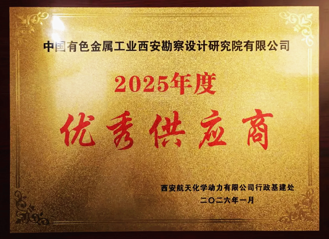 本报讯(通讯员 王凯)近日,中国有色金属工业西安勘察设计研究院有限公司(以下简称“西勘院”)凭借卓越的履约能力与突出的技术创新成果,荣获甲方西安航天化学动力有限公司授予的“2025年度优秀供应商”称号,充分彰显了其在岩土工程领域的扎实技术实力。