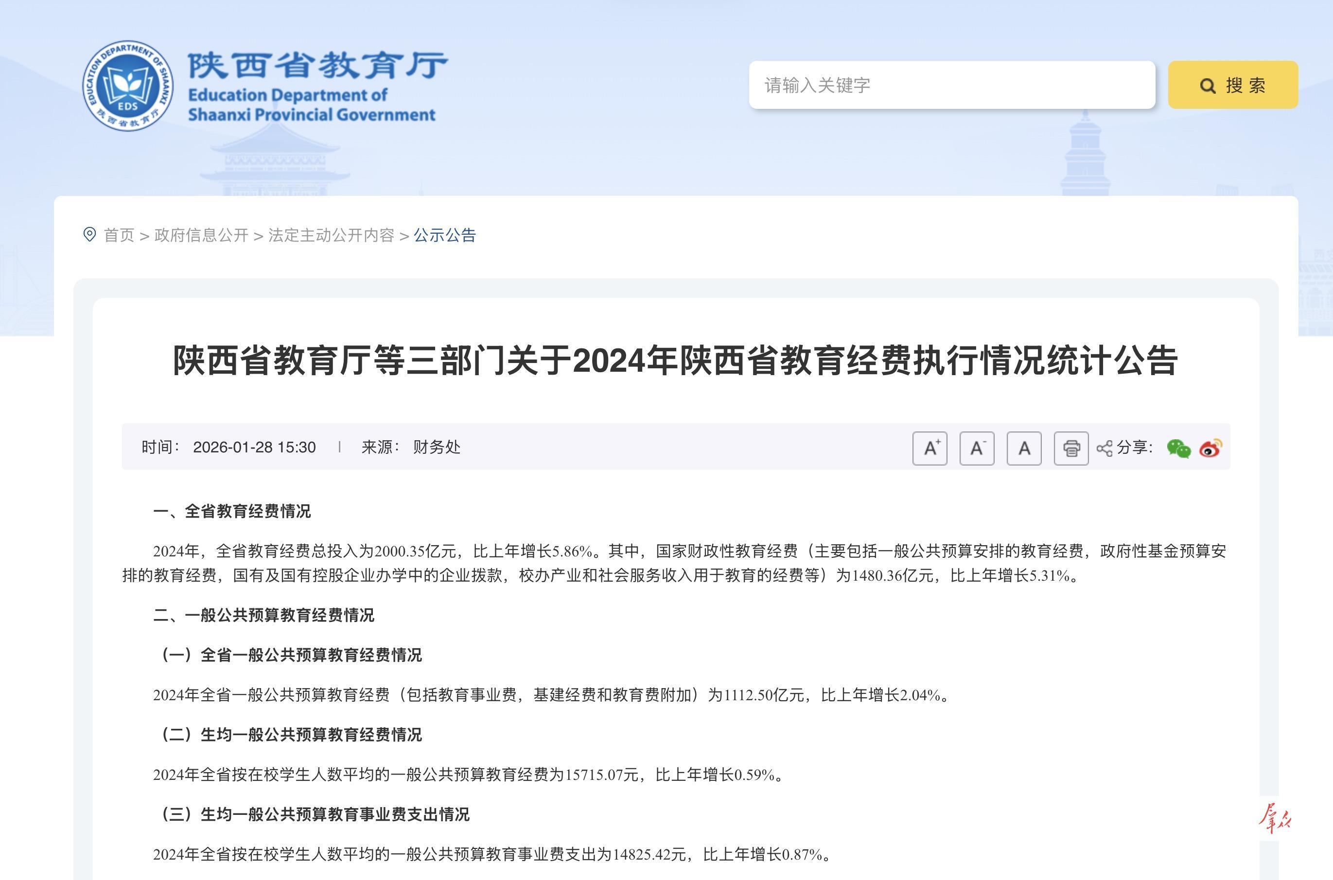 1月30日,记者从陕西省教育厅获悉,省教育厅、省财政厅、省统计局联合发布2024年陕西省教育经费执行情况统计公告(以下简称《公告》)。
