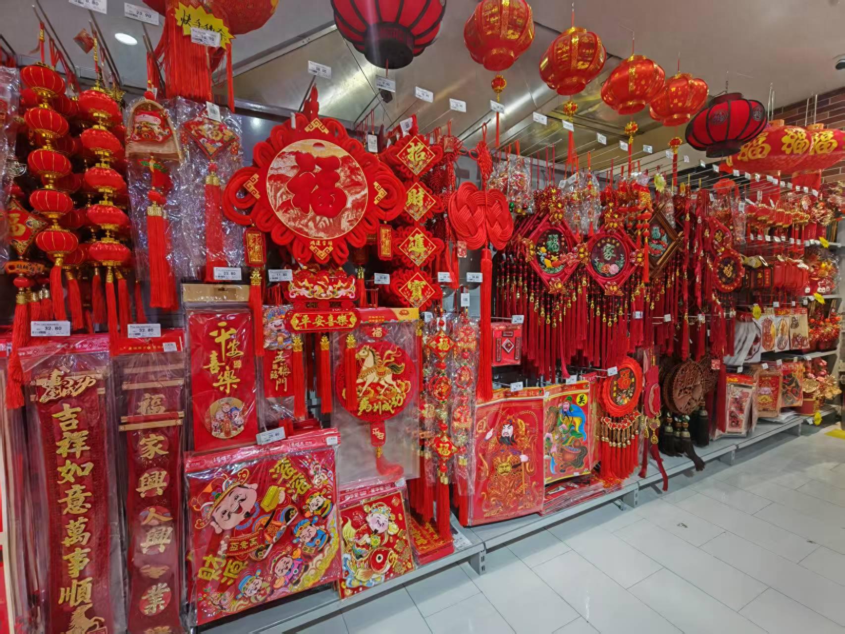 食品货源供应充足的同时,作为过年的必需品,春联、福字、灯笼、挂饰等喜庆用品也进入了热销期。在定边县南市场内,喜庆的春联、五彩的灯笼、萌态十足的窗花搭配马年的特色饰品,将整个商铺装点得喜气洋洋。