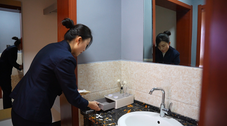 在运动员驻地,服务人员对客房区域开展了全面清洁与设施维护,同时备足各类生活物资,确保运动员在赛期居住舒心、生活便利。“我们专门预留两层客房供运动员入住,房间内全部配备全新床品。除基础洗漱用品外,还提供24小时不限量瓶装饮用水及值班服务,随时响应运动员需求。此外,我们还单独开辟出专属房间作为雪具存放处,全力为运动员营造一个安心、便捷的休整环境。”城南印象宴会酒店常务副总经理李玉环说道。