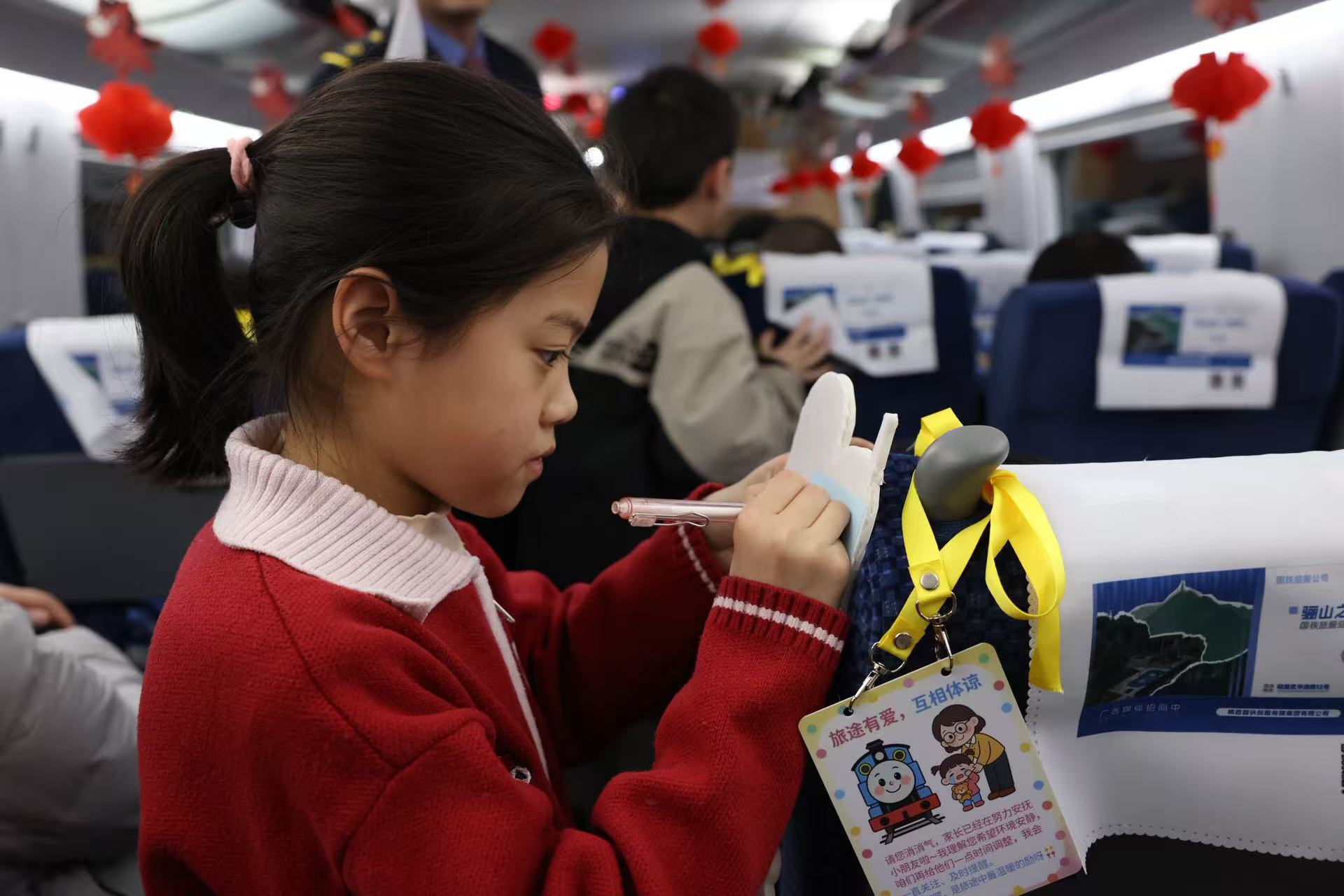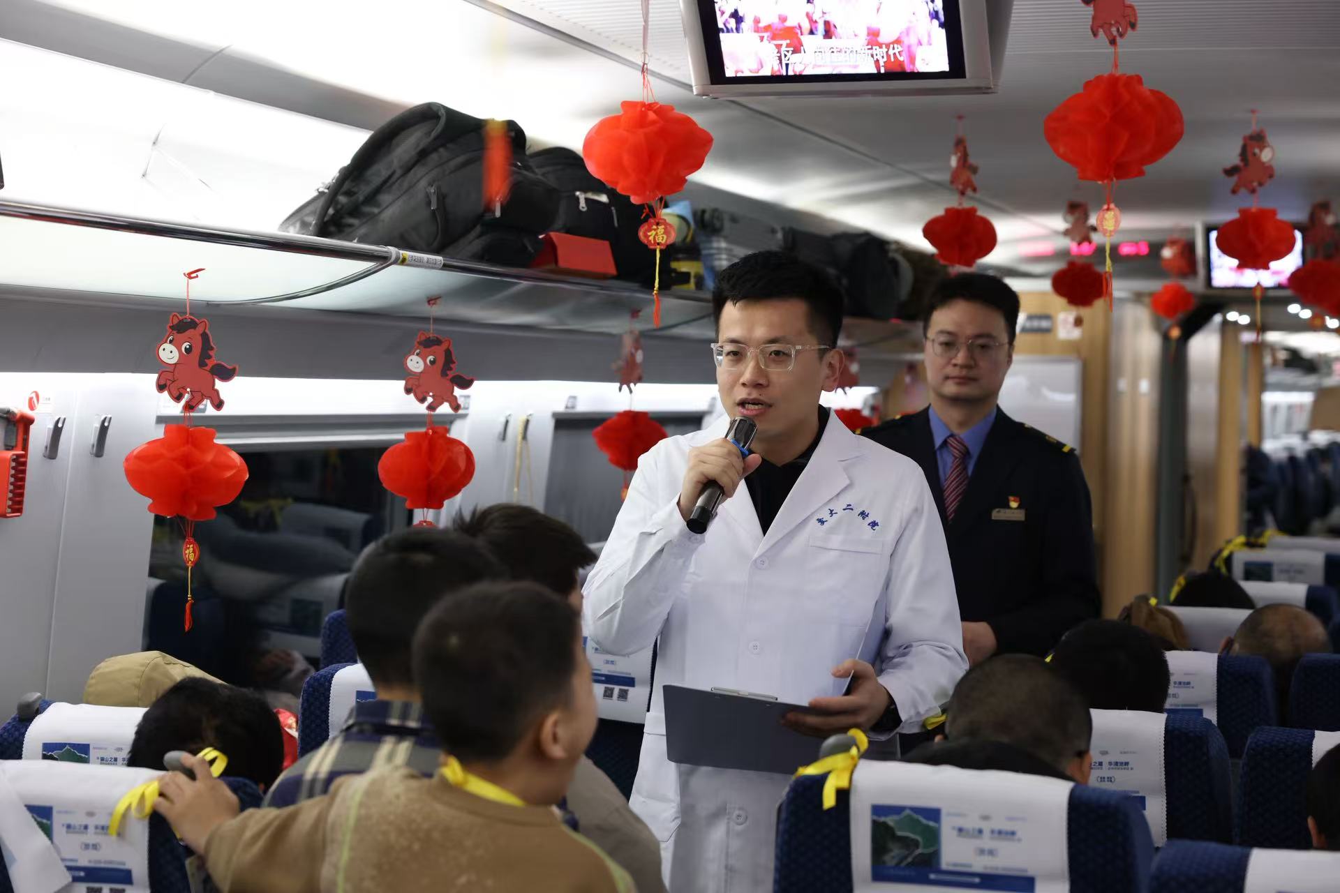 启动活动结束后,9名医学和铁路志愿者组成小分队登上G2851次列车,在首趟行程中面向旅客宣讲了铁路文明出行宣讲,普及了铁路旅行健康知识,展示了专门缓解动车组通过隧道时耳部不适的熊猫保健操,重点介绍了文明乘车引导员招募机制,与旅客进行了互动交流,引导旅客共同完成了一个五彩斑斓的文明心愿墙,让这趟旅程变成一个移动的文明实践课堂。党员列车长张梦雨表示:“有了专业医生的志愿服务和技术指导,让我们在应对旅客突发状况时,心里更踏实了。”“今天带孩子坐火车回家,没想到车上还有医疗救护知识科普和文明出行倡议活动,既让孩子增长了文明出行的知识,又为我们的平安出行多了一份保障。”旅客刘女士说。