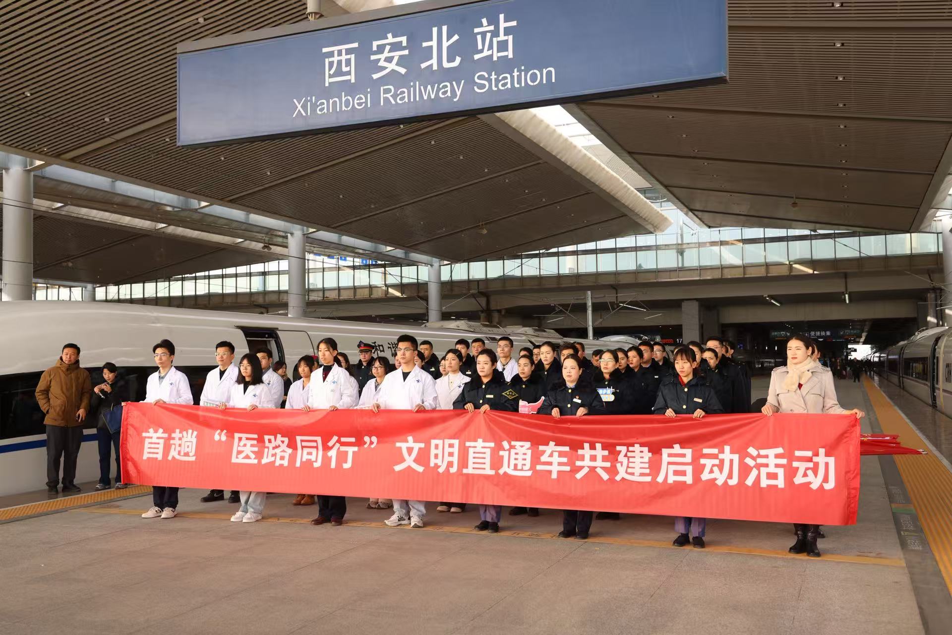 当日上午,首趟“医路同行”文明直通车共建启动活动在西安北站18站台举行。陕西省委文明办文明创建处处长郭文超、陕西省红十字会专职副监事长王博、西安交通大学医学部党委副书记陈晨,西安铁路局有关部门、单位负责人,50名党团员突击队、志愿者团队代表参加。共建双方介绍了共建共倡举措,乘务人员展示了高铁服务礼仪,志愿者代表宣读了共建倡议书,与会领导向参加活动的7支党团员突击队、志愿者团队授旗,最后在共建倡议上签名承诺。